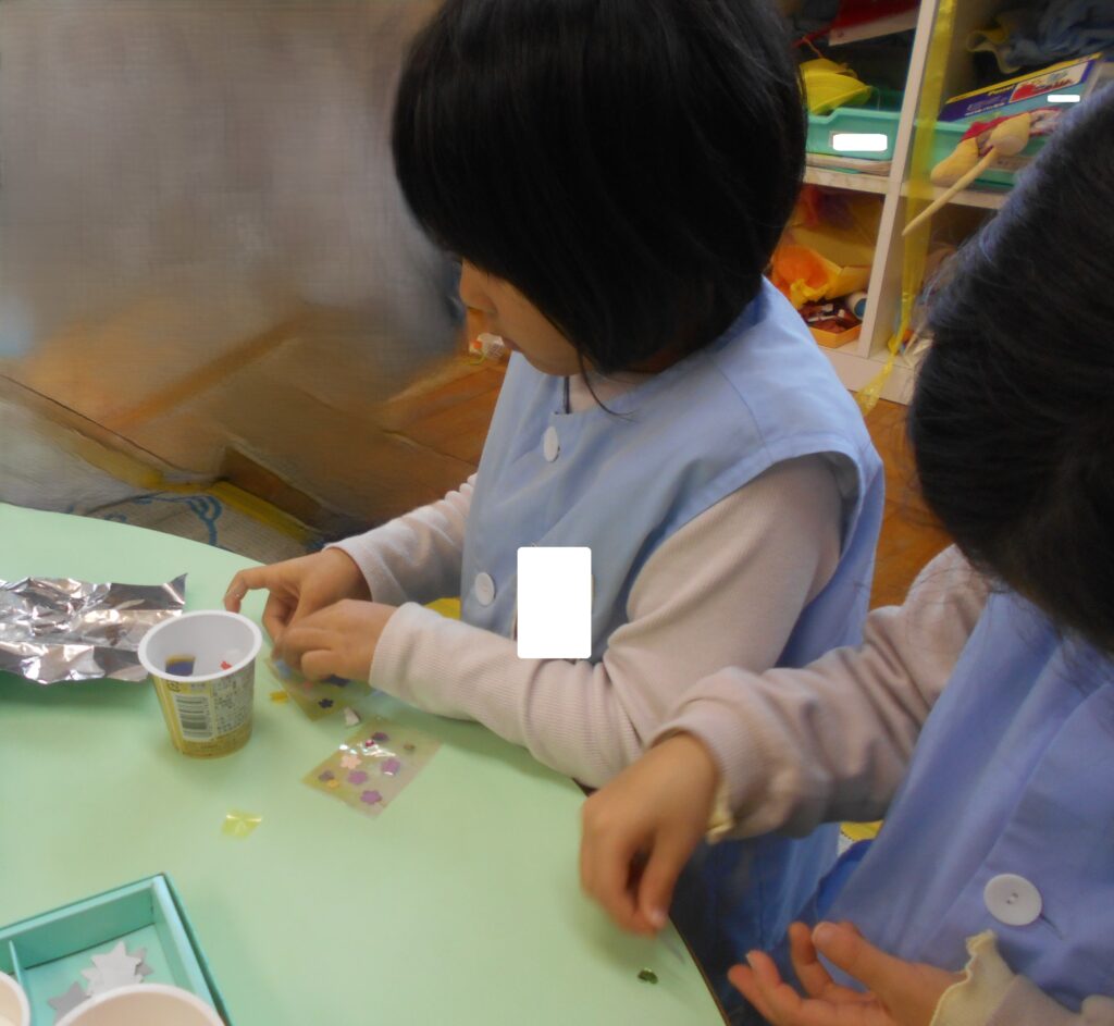 ばら組のお友達は,セロハンにキラキラした紙やお花を貼り付けて,自分がわくわくする宝物を作っています。