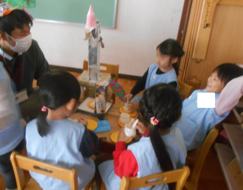 ばら組のお友達は,ユニコーンを囲んでお友達とお茶を飲んだり,ユニコーンのお世話をしたりしています。