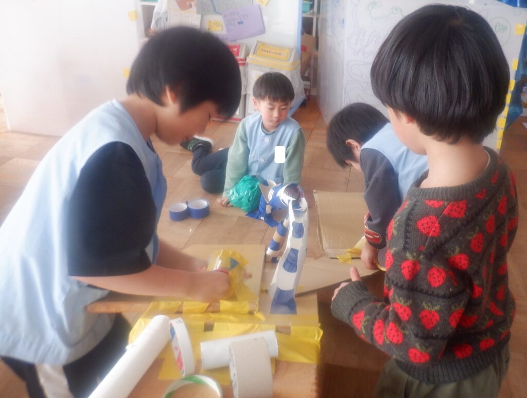 もり組のお友達は,テープ芯やキャップを転がすコースがより楽しくなるように坂の角度を変えたり,素材を工夫したりしています。