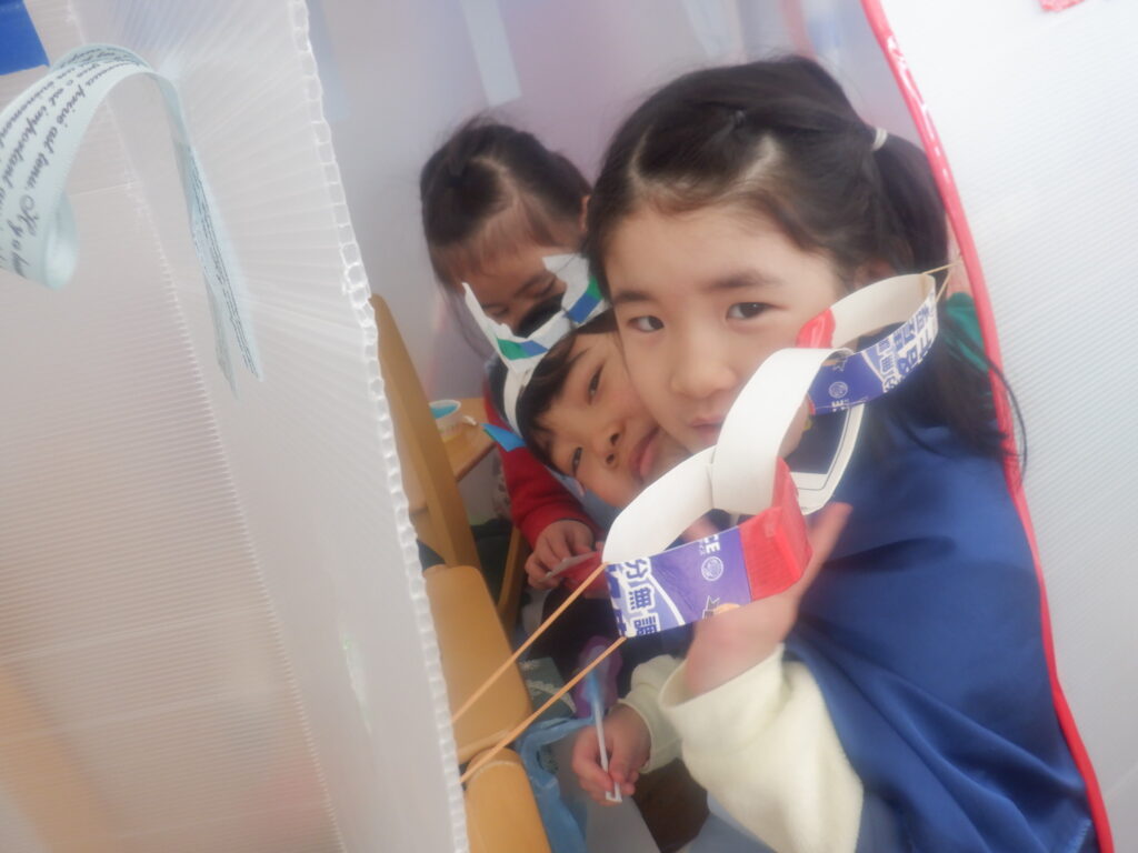 もり組のお友達は,お家の中でパーティをして遊びました。家の鍵がしっかりかかっていることを確認しています。