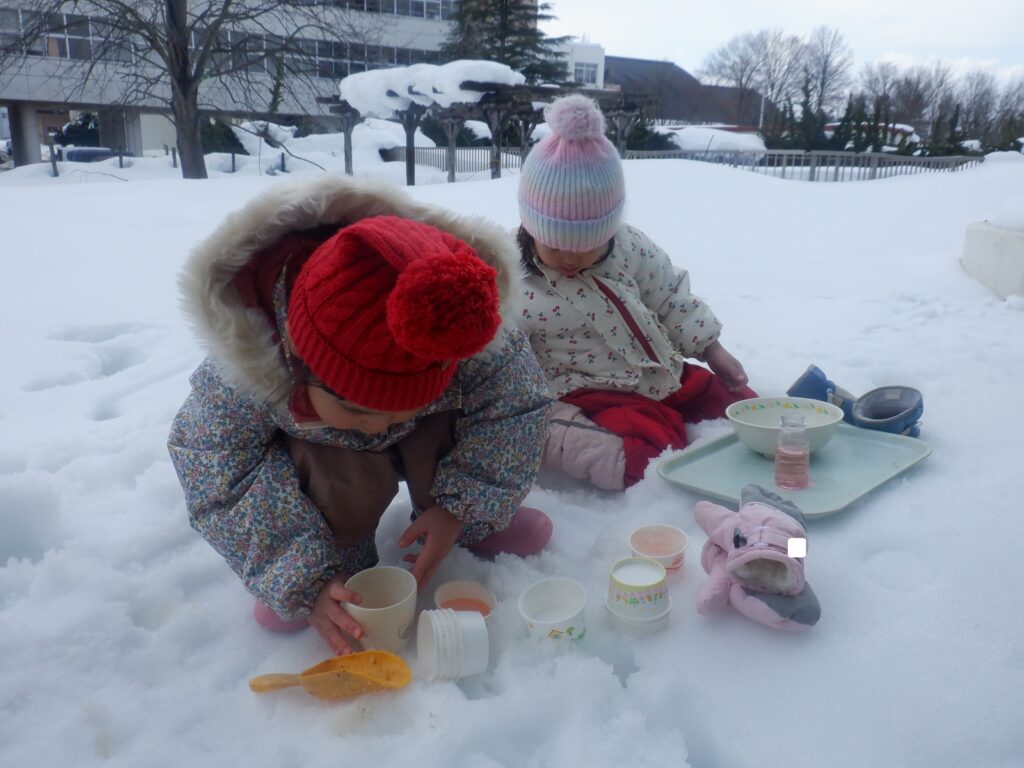 さくら組のお友達は,スコップで雪を掘ってその中に色水を流し込んでいます。