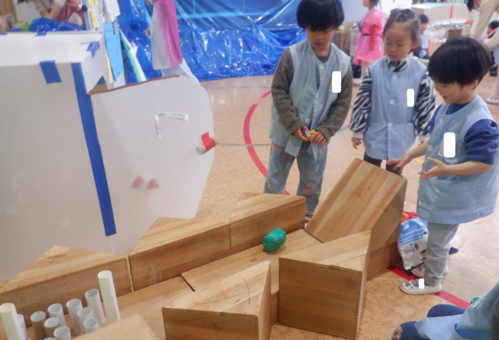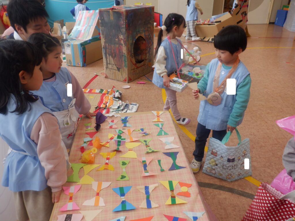 もり組とばら組のお友達は,お店屋さんになって,お客さんに品物を紹介したり,自動販売機の商品を渡したりしています。