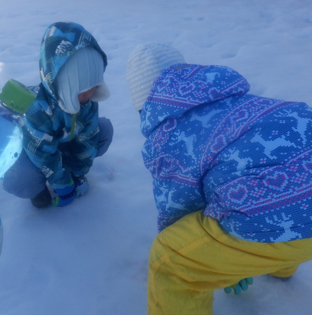 もり組のお友達は,硬くなっていた雪の表面を削って,相撲の塩に見立てて投げ,相撲をとっています。