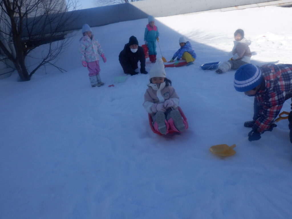 もり組のお友達は,そりに乗った友達を滑らせ,カーリングをしました。友達が乗ったそりが的まで届くように,スコップで表面を削っています。