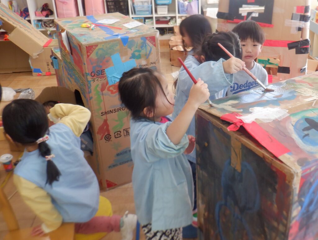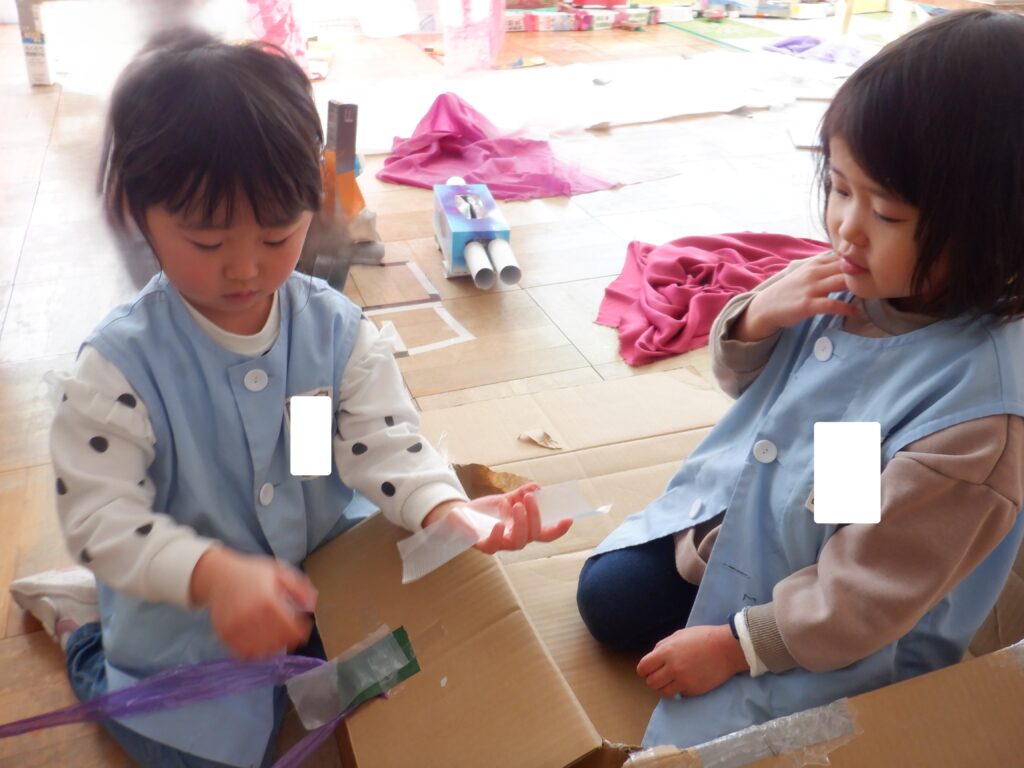 さくら組のお友達は,ダンボールで作った新幹線に乗って,東京まで出かけました。二人で乗ったら途中で壊れてしまったので,修理をしています。
