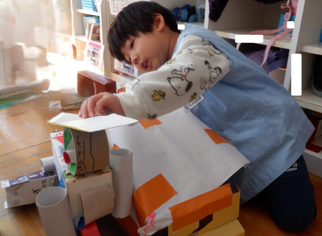 さくら組のお友達は,いろいろな素材を組み合わせて,ゴミ収集車と除雪車を作りました。2台をくっつけて大きな車にして,位置を考えながらライトを取りつけました。