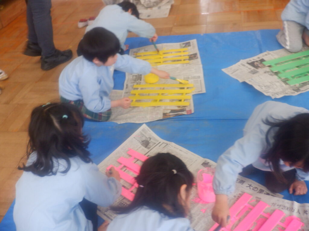 もり組のお友達は,すのこに隙間があかないように絵の具で丁寧に色を塗っています。思いを込めて卒園記念品を作成中です。