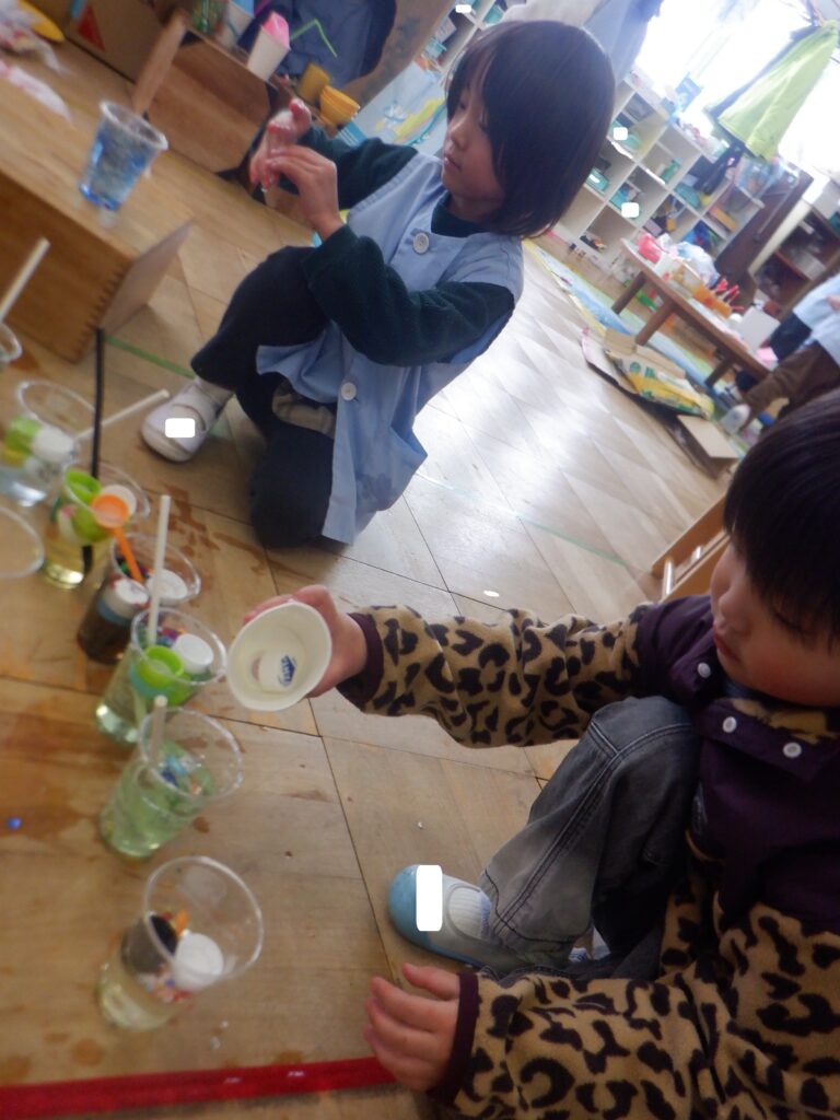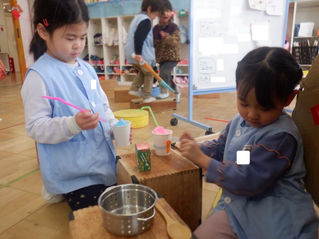 ばら組のお友達は,色水の入ったカップに,氷に見立てたペットボトルのキャップやキラキラしたビーズを入れてジュースを作っています。