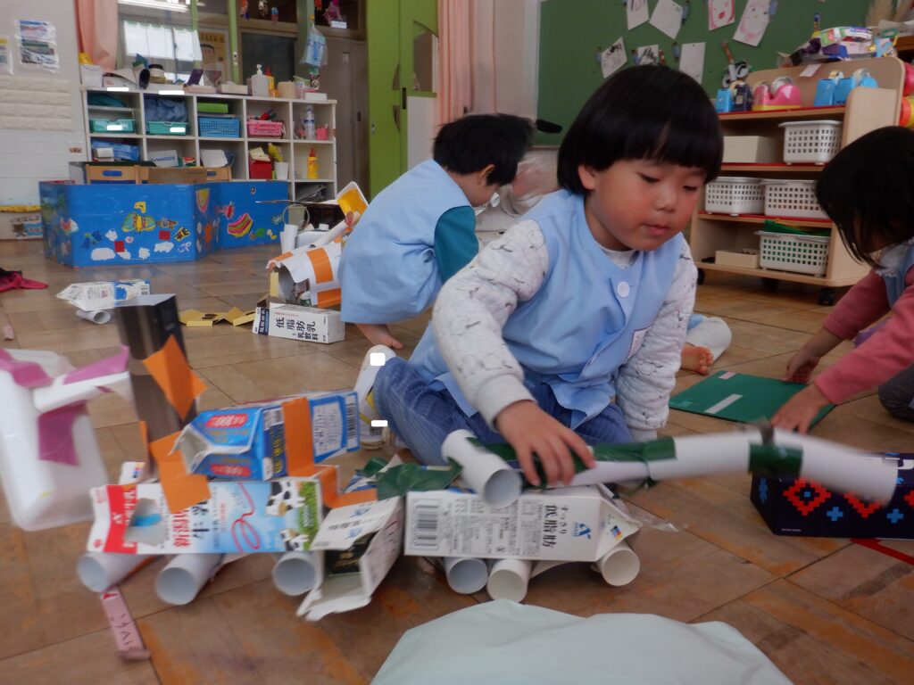 さくら組のお友達は,ソフト積み木を積んで病院を作りました。牛乳パックの中には,お薬が入っています。