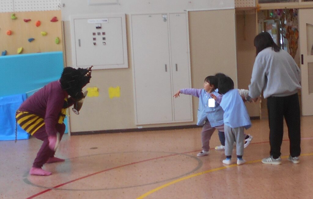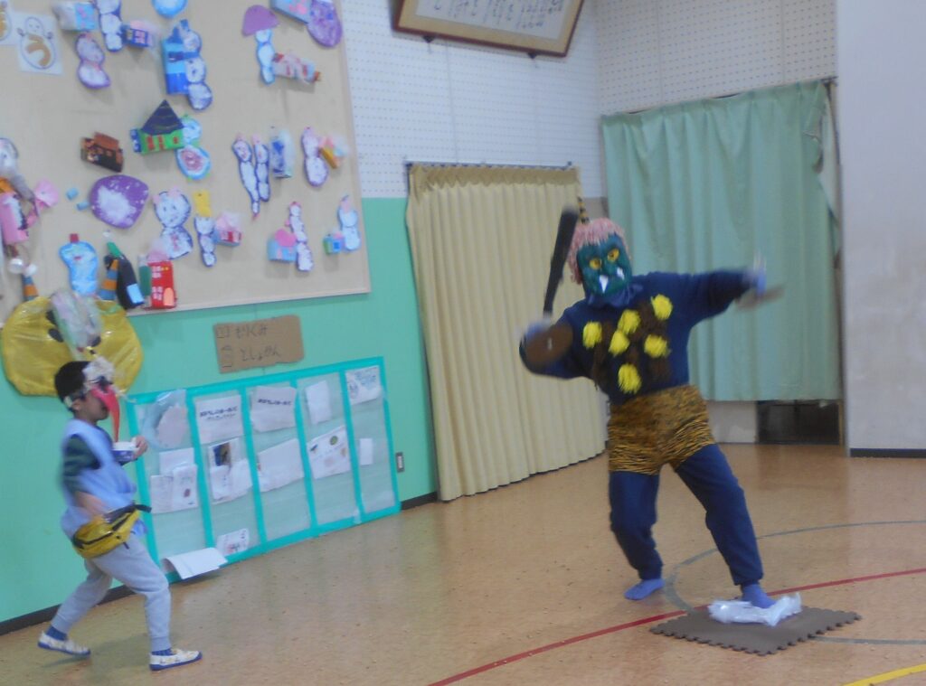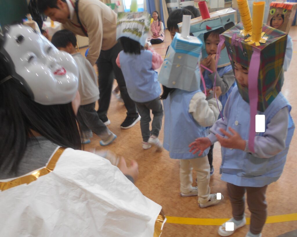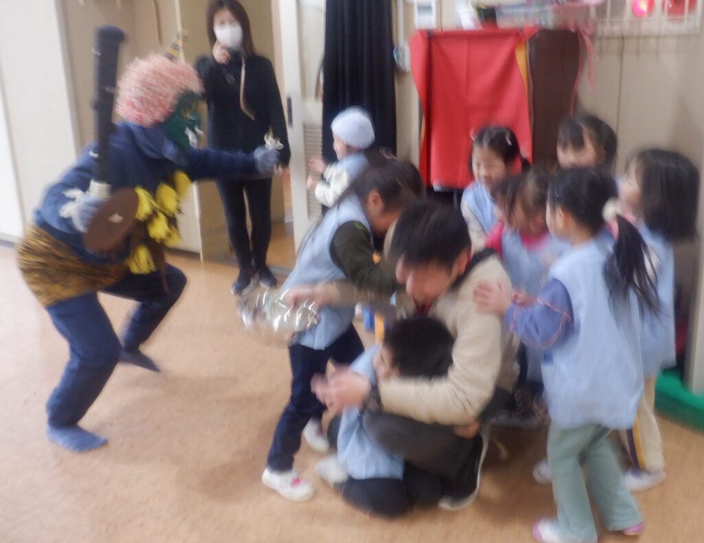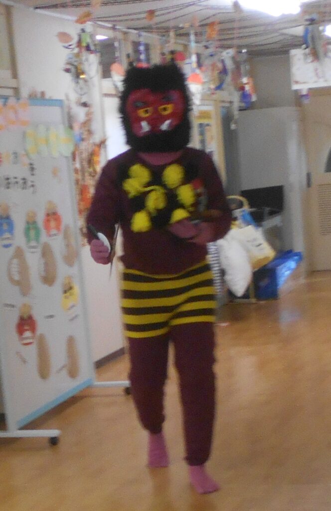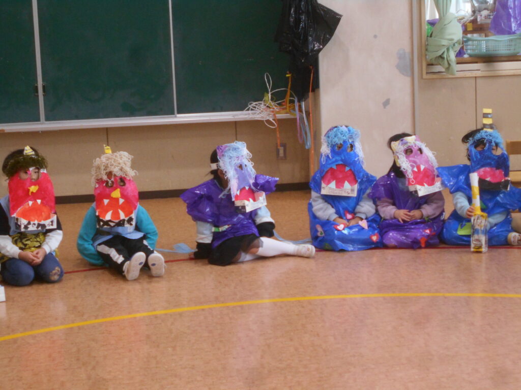 今日は,豆まき会がありました。赤鬼と青鬼が幼稚園にやってきました。もり組のお友達が罠を仕掛けたり,みんなで鬼の嫌いな豆をまいたりすると鬼は逃げていきました。