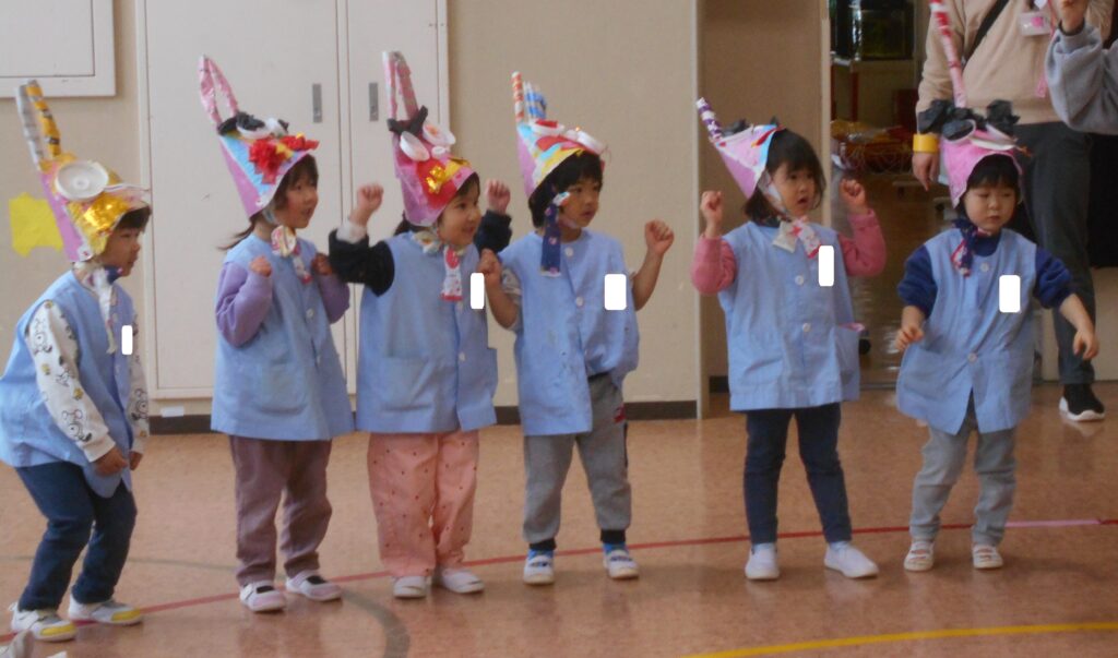 福の神の前で元気にダンスをしました。「つのつの いっぽん あかおにさん」