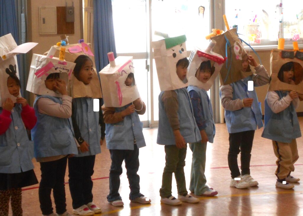 その後,遊戯室で節分の会をしました。自分で作った鬼のお面を着けて,追い出したい鬼を発表しました。