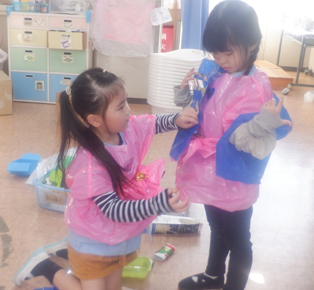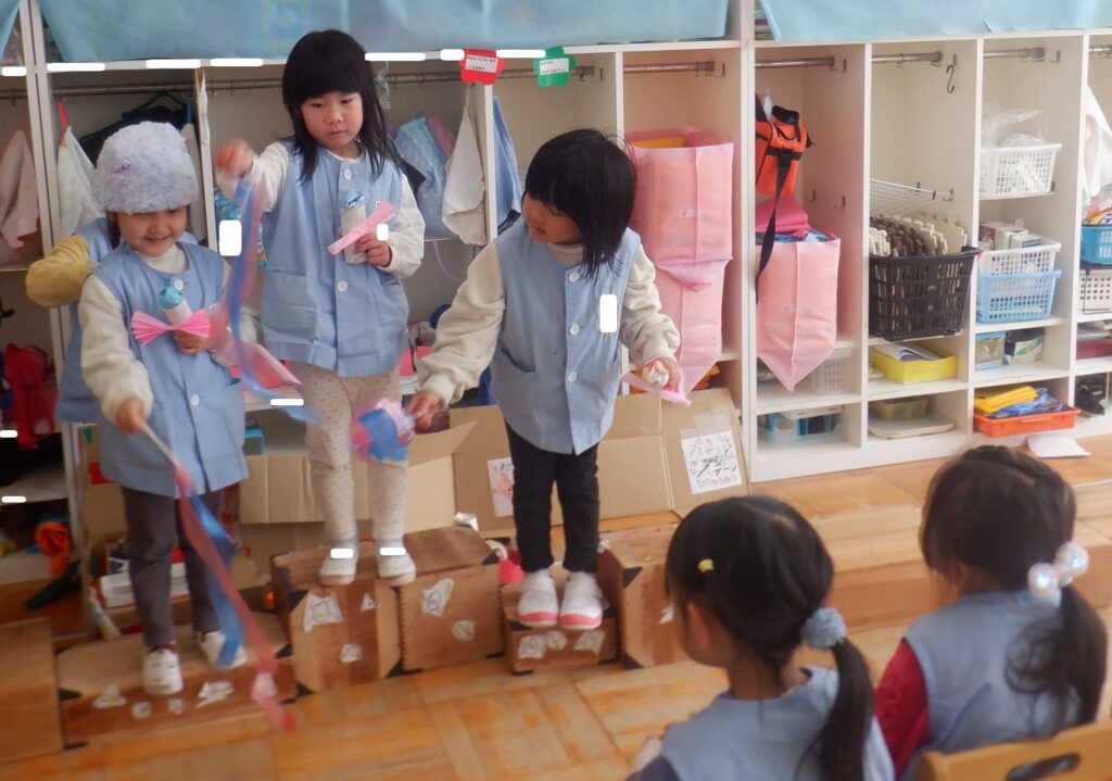 ばら組のお友達は,紙で作ったリボンやキラキラしたビーズを積み木に貼ってステージを作りました。ステージの上でアイドルになりきって踊っています。