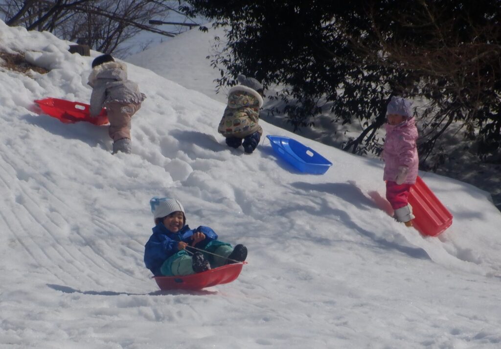 さくら組のお友達は,ヤッホー広場で雪遊びをしました。築山の上から風を感じながらそりで滑ったり,雪の感触を楽しみながら転がったりしています。