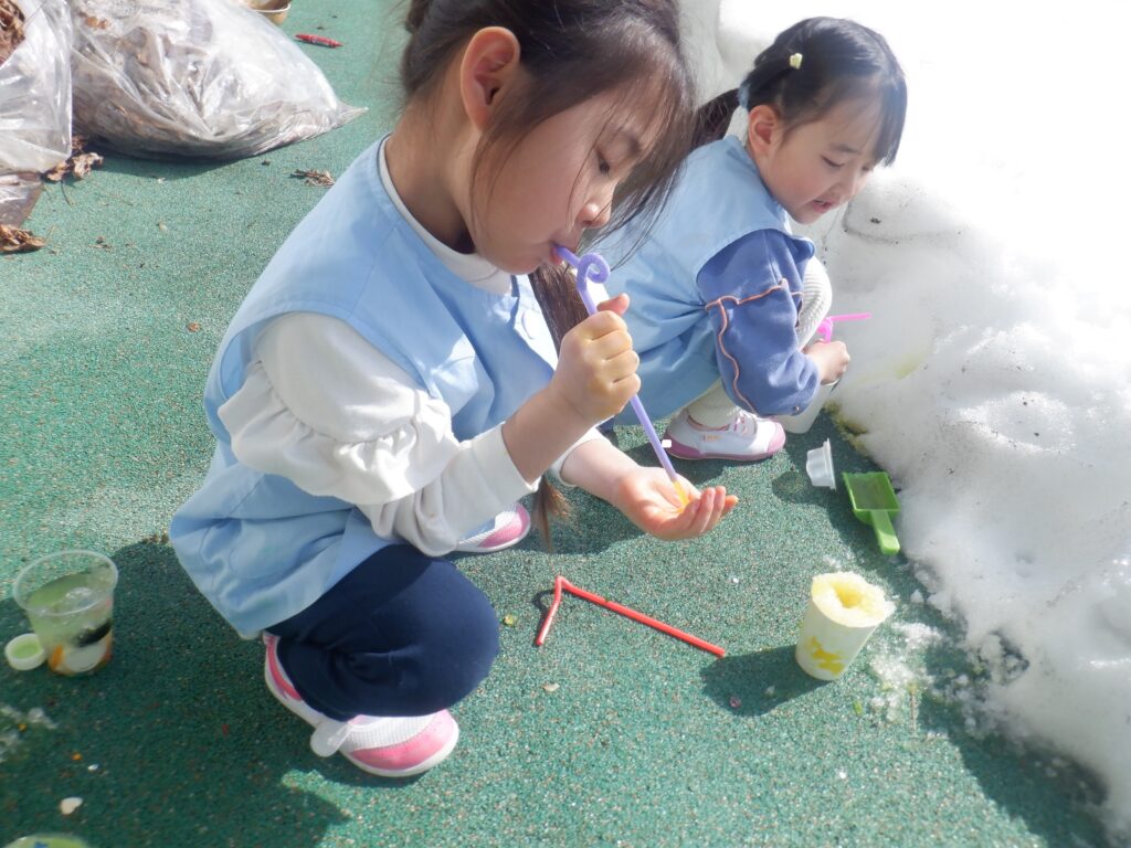 ばら組のお友達は,色水の入ったコップの中に雪を入れました。ストローを雪にさすと雪がストローの中に入り,ストローを吹くと中に入った雪が出てきました。