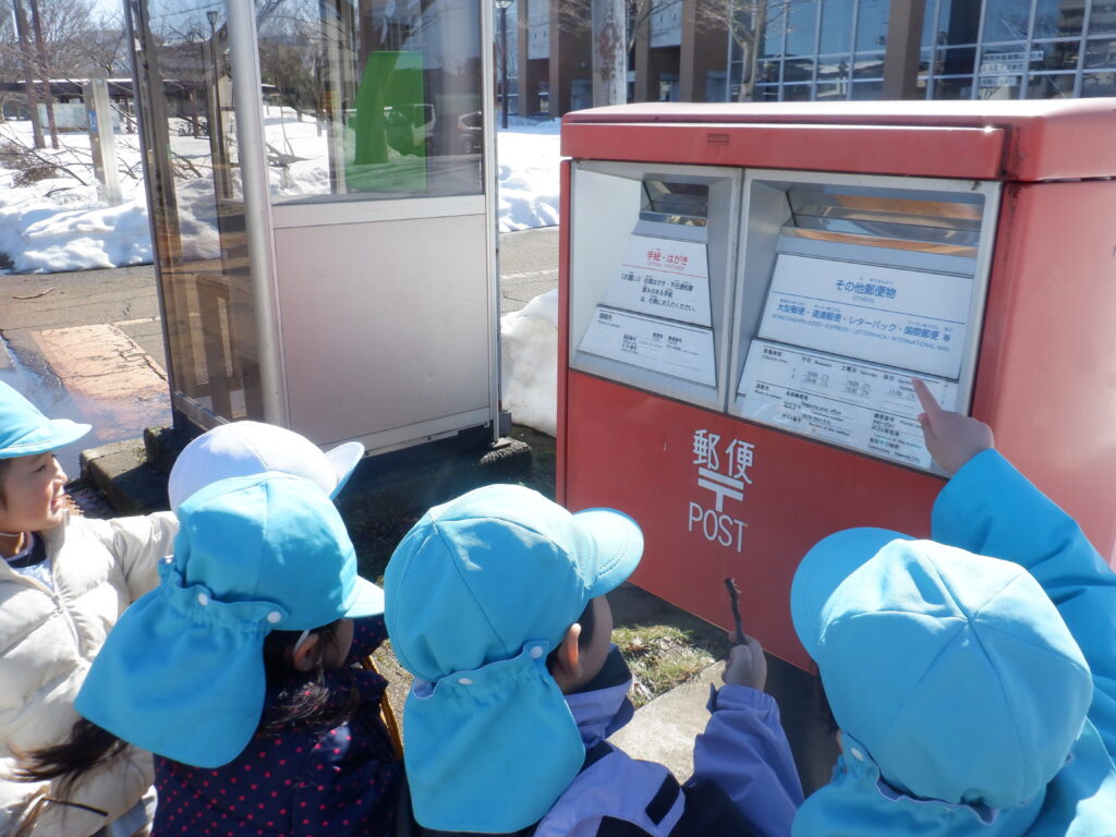 さくら組のお友達は,外の景色を見ながら歩いている途中で,ポストや公衆電話を見付けました。