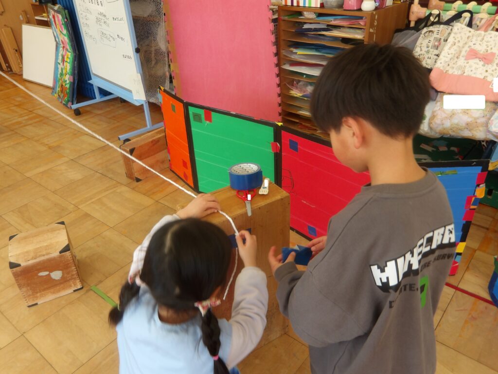 ばら組のお友達は,みんなが楽しめるアスレチックを作りたいと考えて,アイデアを伝えながら,ひもを積み木に貼り付けています。