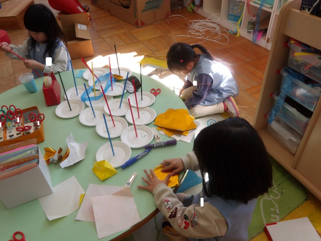 ばら組のお友達は,紙皿とストローで輪投げの的を作り,紙皿に点数を書きました。金色の折り紙で輪投げの景品用のメダルを作っています。