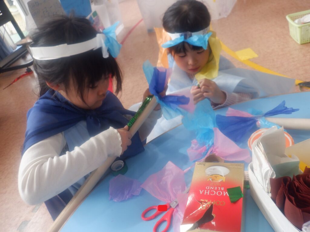 もり組のお友達は,うみねこマーメイドになってアイテム作りをしています。長い筒にお花紙のヒラヒラを付けたり,棒にキラキラテープを貼ってきれいに飾り付けをしたりしています。