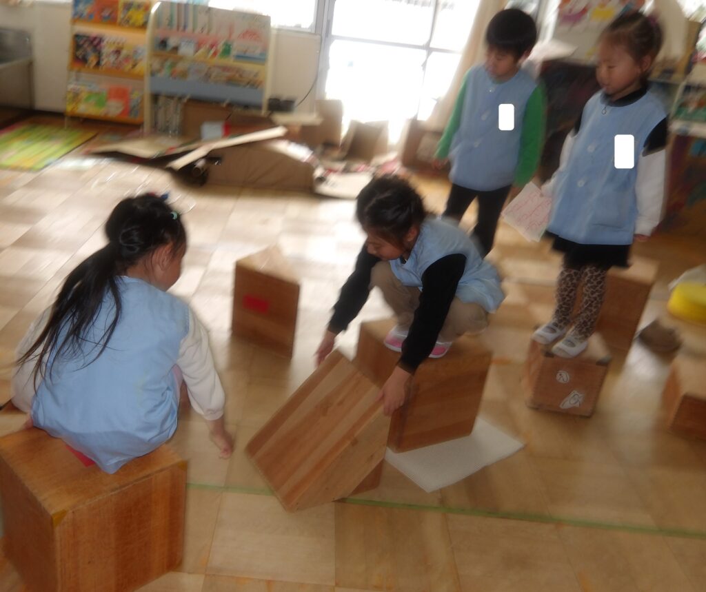 ばら組のお友達は,積み木を並べてアスレチック作りです。形の違う積み木をどう置いたらよいかをお友達と一緒に考えます。