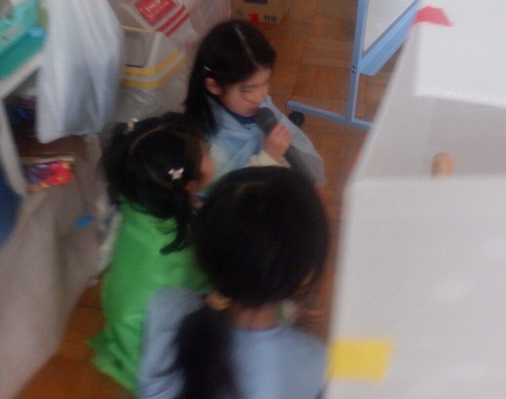 もり組のお友達は,もり村に住んでいる皆さんに,話す内容や声の大きさを考えながら,村内放送で天気予報を伝えています。