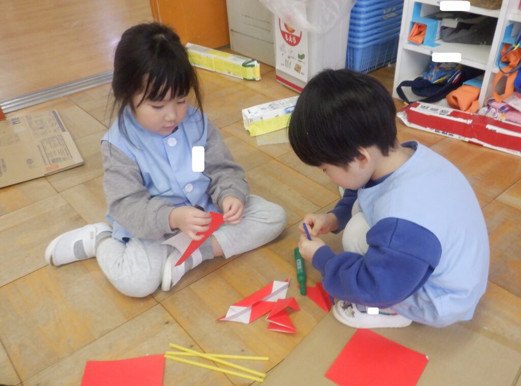さくら組のお友達は,赤色の折り紙で形を整えながら,忍者が食べるトマトを作っています。