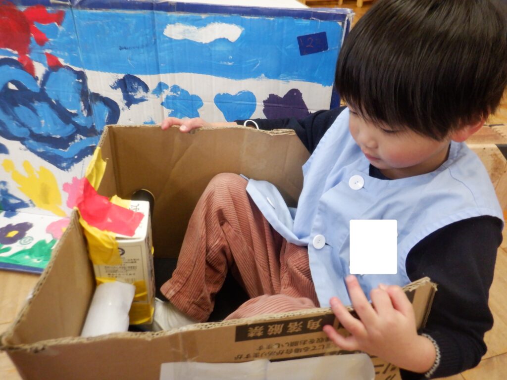 ばら組のお友達は,自分がちょうど入れるダンボールを使って,乗り心地を確認しながらバイクを作りました。