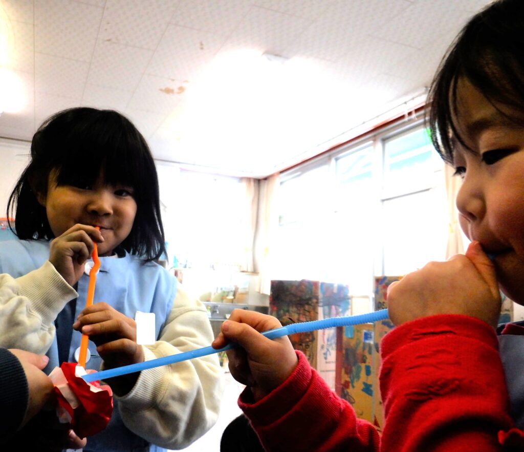 さくら組のお友達とばら組のお友達は,忍者の「すいとんの術」で使用するストローを使って,みんなでトマトジュースを飲んでいます。