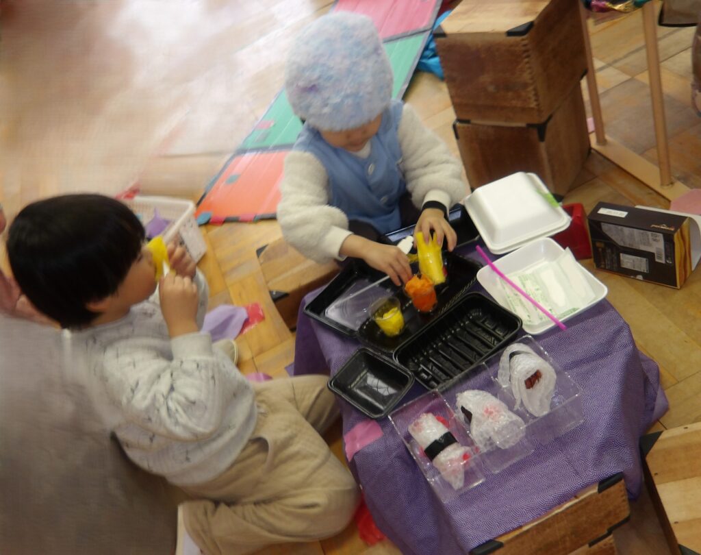 さくら組のお友達とばら組のお友達は,緩衝材(プチプチ)をご飯に見立て,その中に赤いお花紙を丸めた梅干を入れておにぎりを作りました。