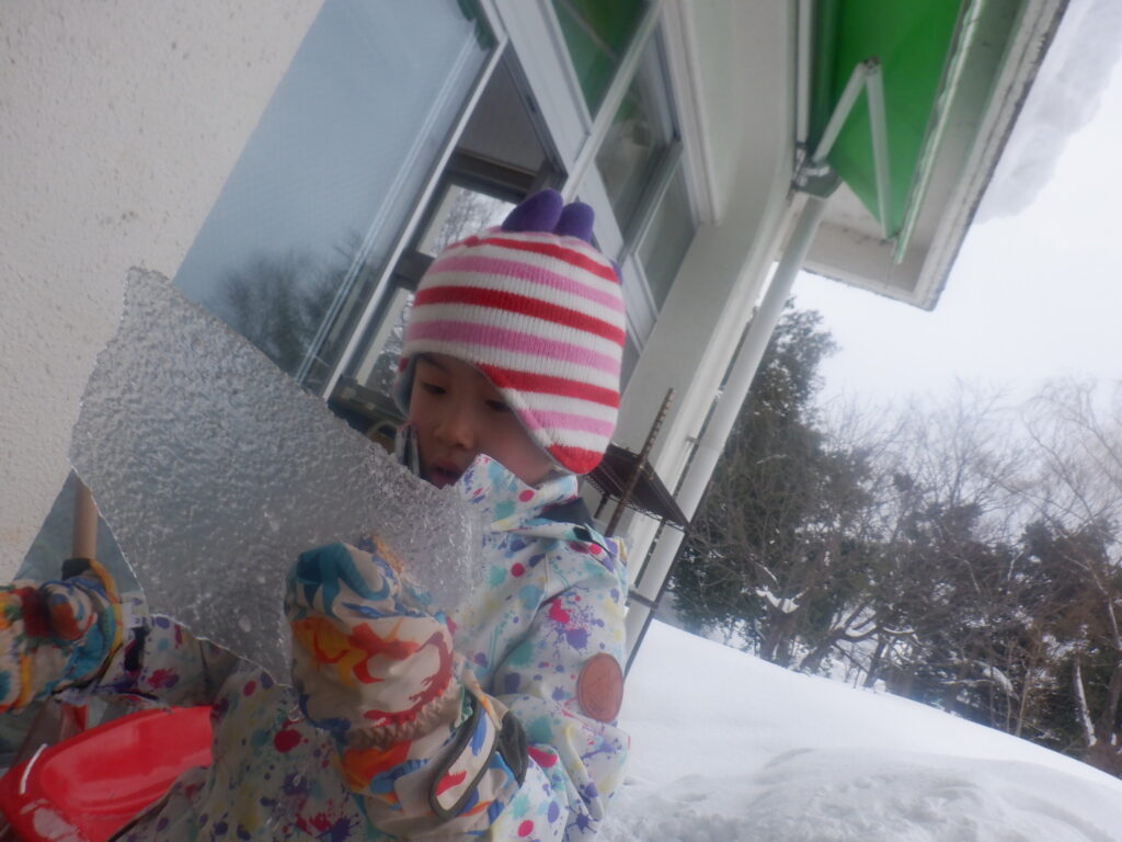もり組のお友達は,テラスにあったタライに大きな氷が張っているのを見付けました。