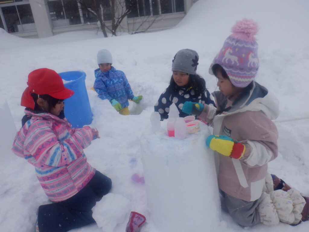 もり組のお友達は,イメージを膨らませながら,固めた雪に色水をかけてジュエリーを作って並べています。