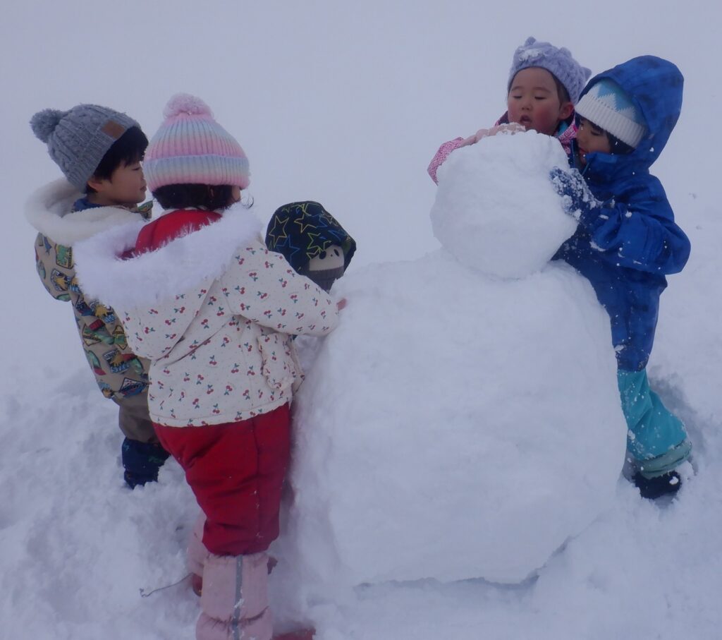 さくら組のお友達は,小学校の広いグラウンドで,みんなで力を合わせて雪玉を転がし,雪だるまを作りました。