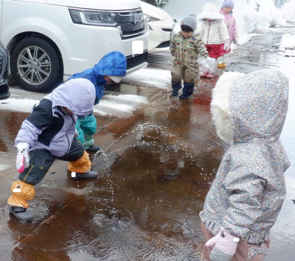 さくら組のお友達は,小学校のグラウンドまでお散歩に出かけました。途中,消雪パイプの水が勢いよく出ているのを見つけて様子を見ています。