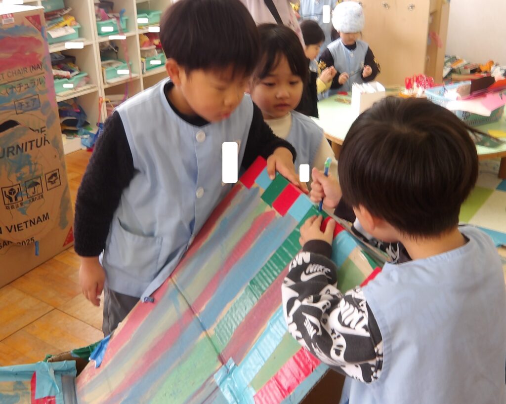 ばら組のお友達は,ストローとビーズを組み合わせて飾りを作り,以前から作っていたお家の屋根につけています。