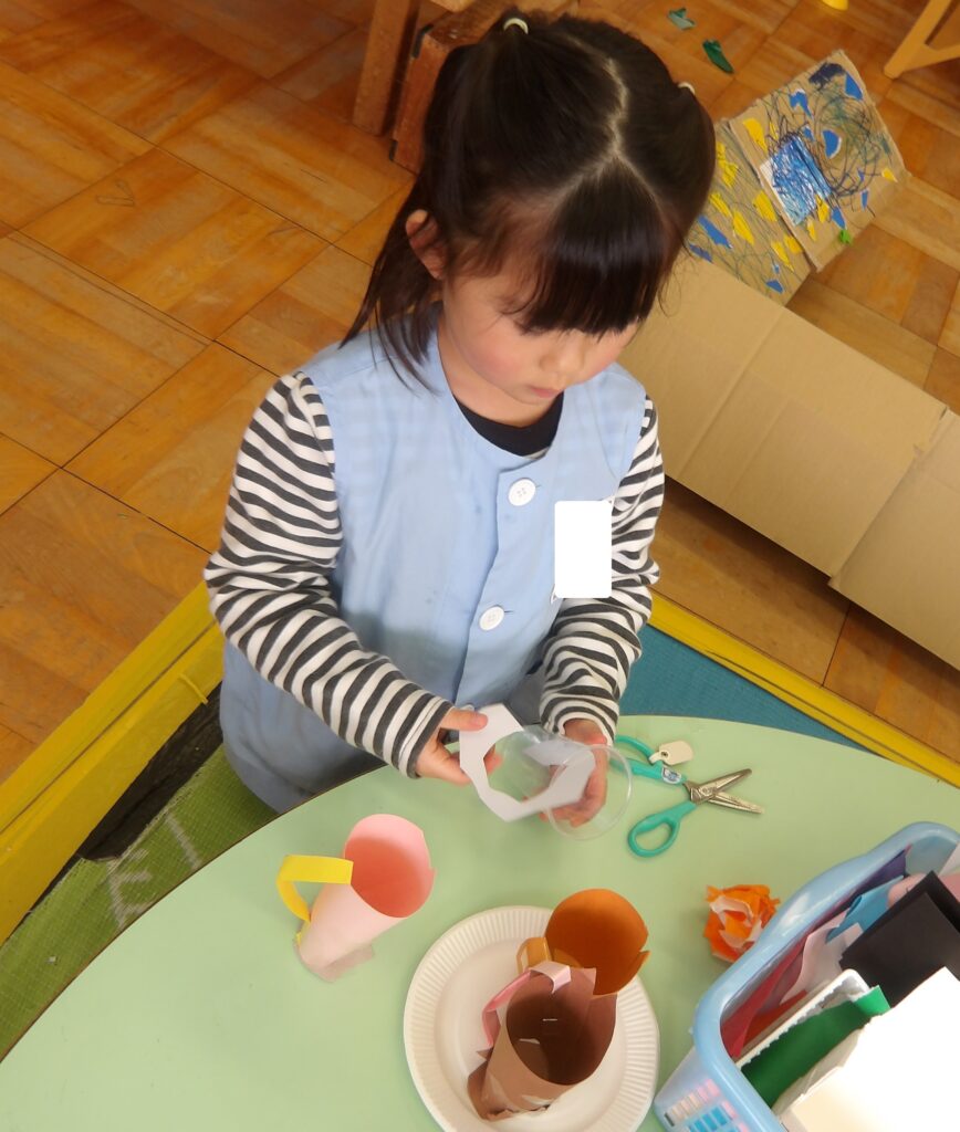 ばら組のお友達は,透明カップに紙を巻きつけてコップの型をとっています。モールや紙でコップの持ち手をつけて持ちやすくしています。