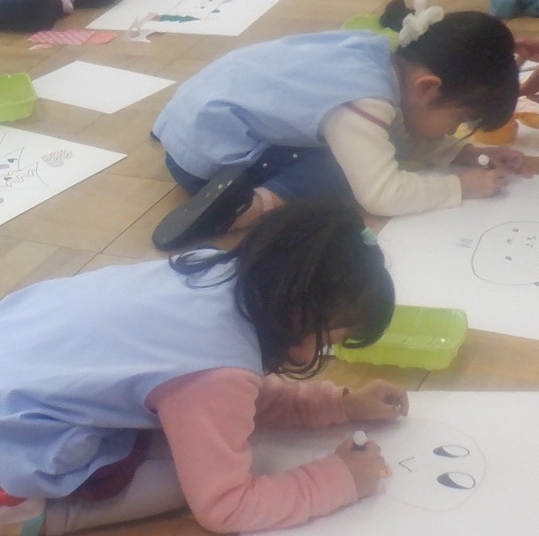 もり組のお友達は,遊戯室の壁面作りをしました。幼稚園で過ごしたことを思いながら,大きな紙に動物や生き物を描いています。
