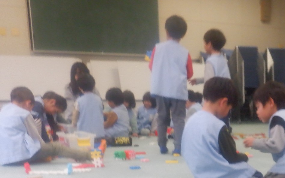 つくし会清掃作業があり.お家の方がお部屋を掃除してくださっている間,小学校の会議室に行って遊びました。卒園式に歌う歌の練習をしたり,積み木やブロックで遊んだりしました。