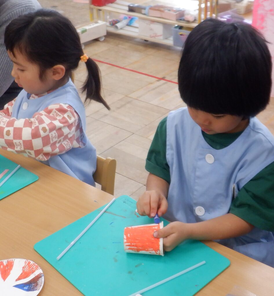 さくら組のお友達は,次の学年に飛んでいこうという思いをもち,気球づくりをしました。好きな色を選んで紙コップにクレヨンで色を塗っています。