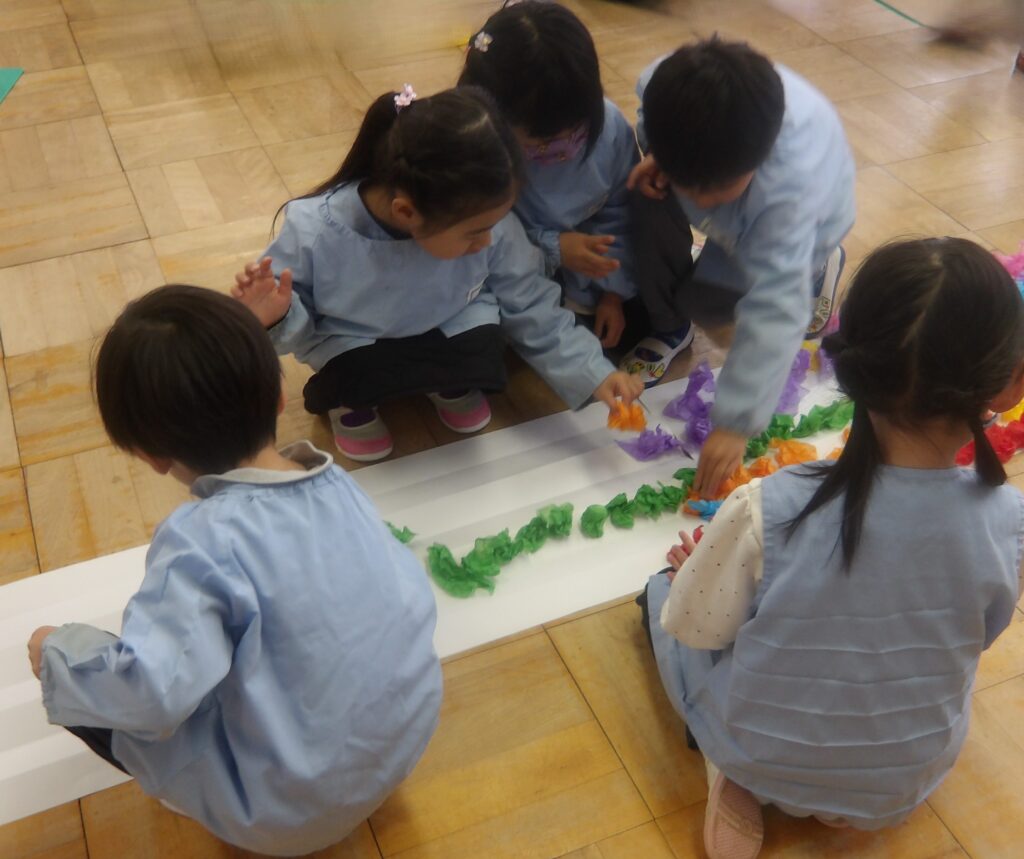 ばら組のお友達は,みんなでお部屋の飾りを作りました。お花紙をフワッと丸めて順番に貼り,大きな虹ができました。