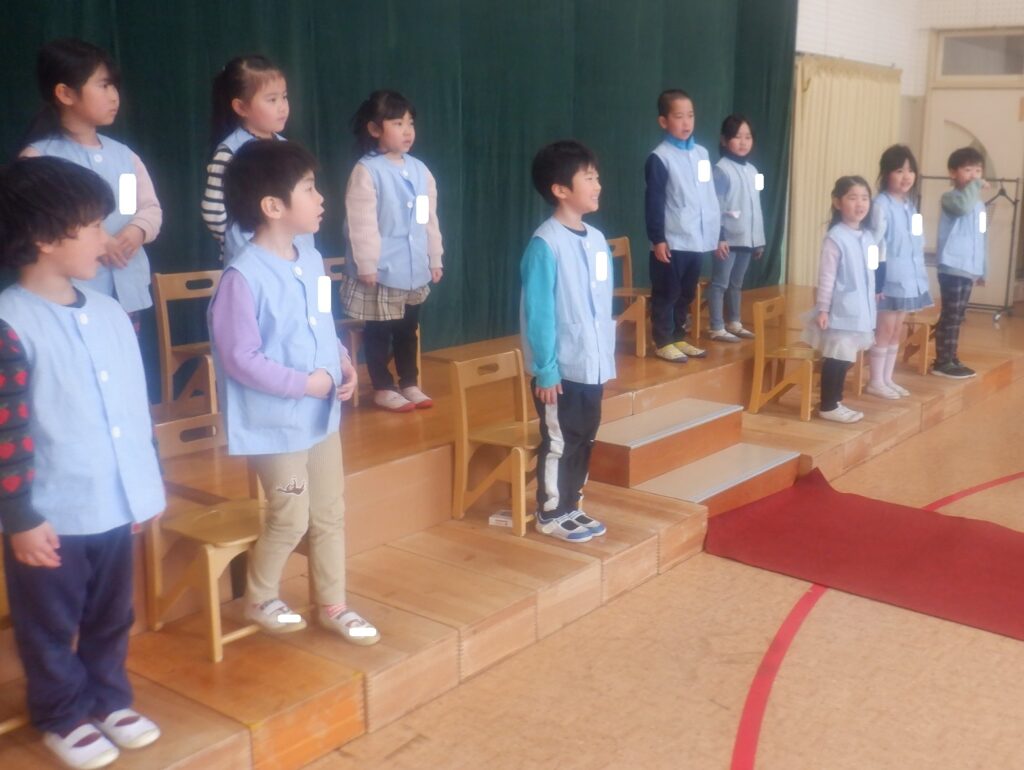 もり組のお友達は,卒園式に向けて見通しをもつために,お部屋で昨年の卒園式のDVDを見ました。