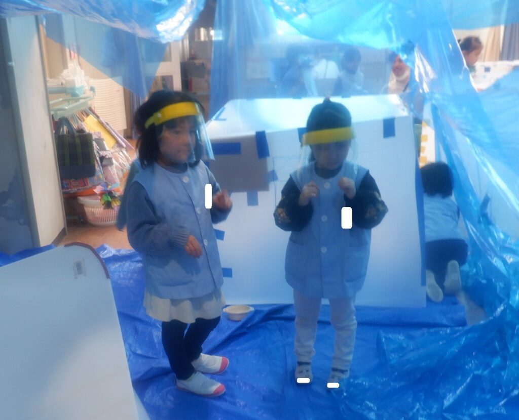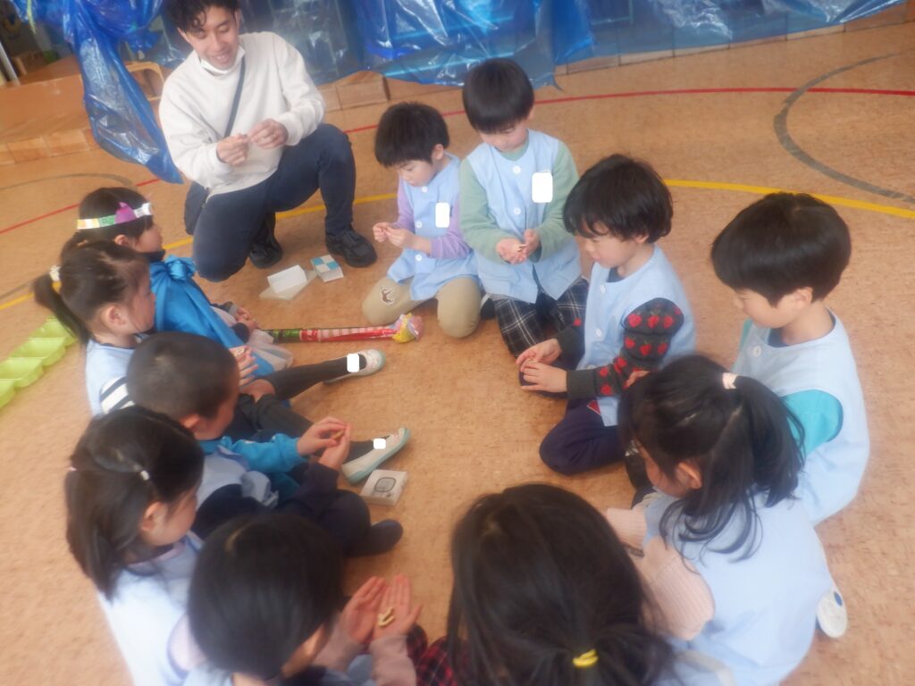 もり組のお友達は,卒園記念品につけるプレートの準備をしています。一人一人文字のパーツを目をつぶって選びました。