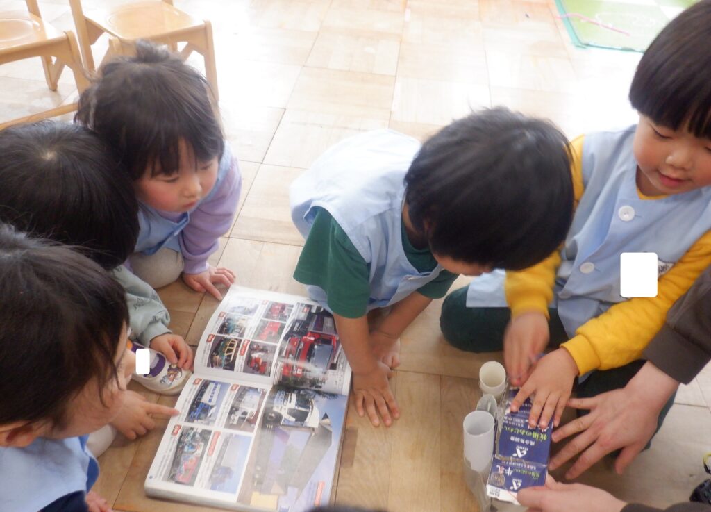 さくら組のお友達は,牛乳パックに切り込みを入れて荷台が開くようにして,ウイングボディトラックを作りました。図鑑を広げて,お友達にトラックを紹介しています。