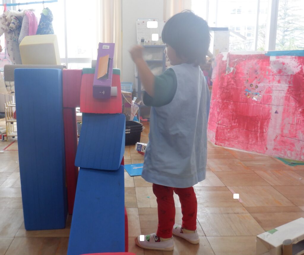 さくら組のお友達は,ソフトブロックを組み合わせて坂道を作りました。車がゆっくりと坂道を登っています。