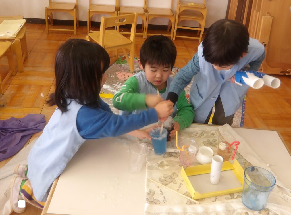 ばら組のお友達は,色水の入ったコップの中に氷や雪,キラキラビーズなどを入れて割りばしでかき混ぜてシャーベットを作っています。