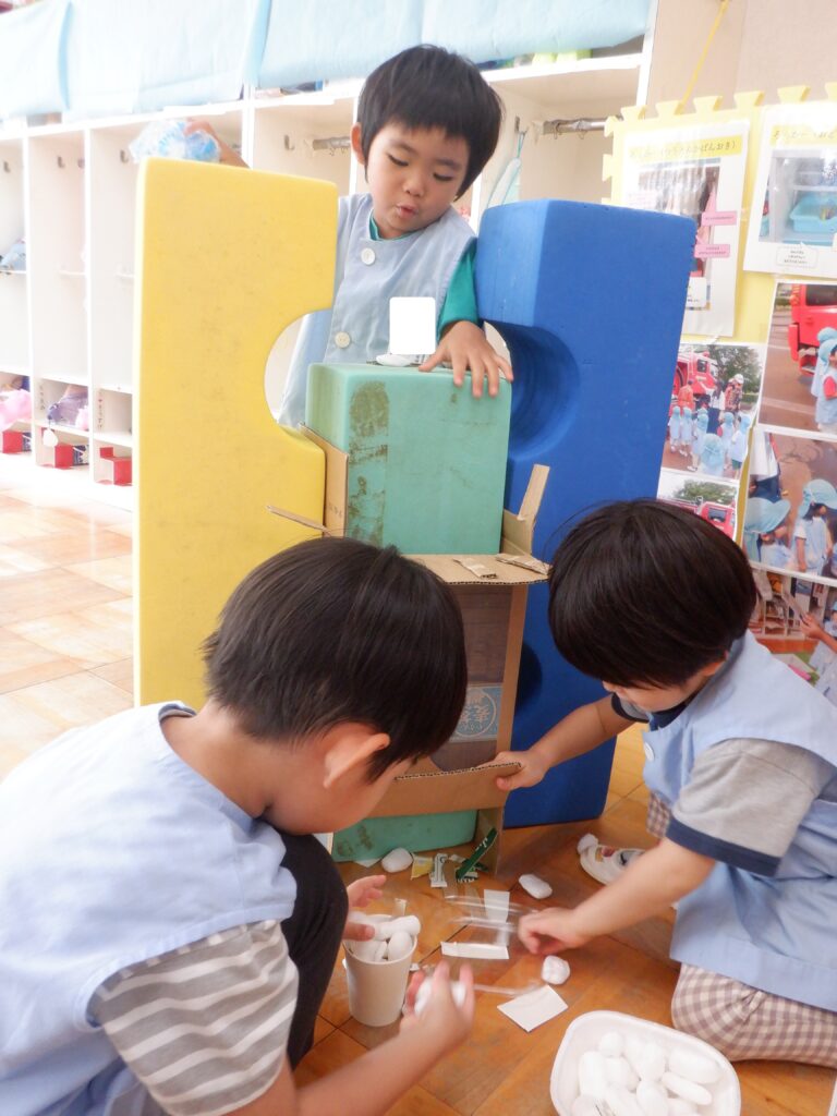 さくら組のお友達は,ソフト積み木や段ボールを組み合わせて作った自動販売機で遊んでいます。