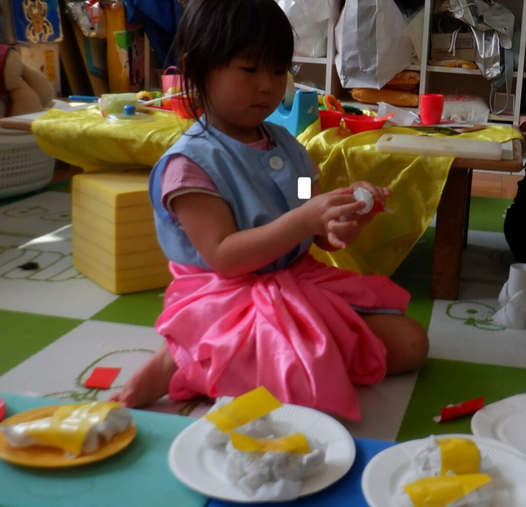 さくら組のお友達は,ペーパーを丸めたごはんに,折り紙で作ったネタをのせてお寿司を作って並べています。