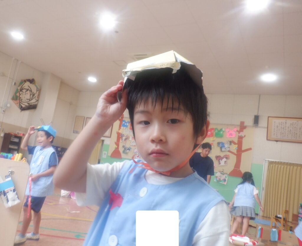 もり組のお友達は,空き箱を使って,自分の頭の大きさに合うように工夫しながら,保安官の帽子を作りました。