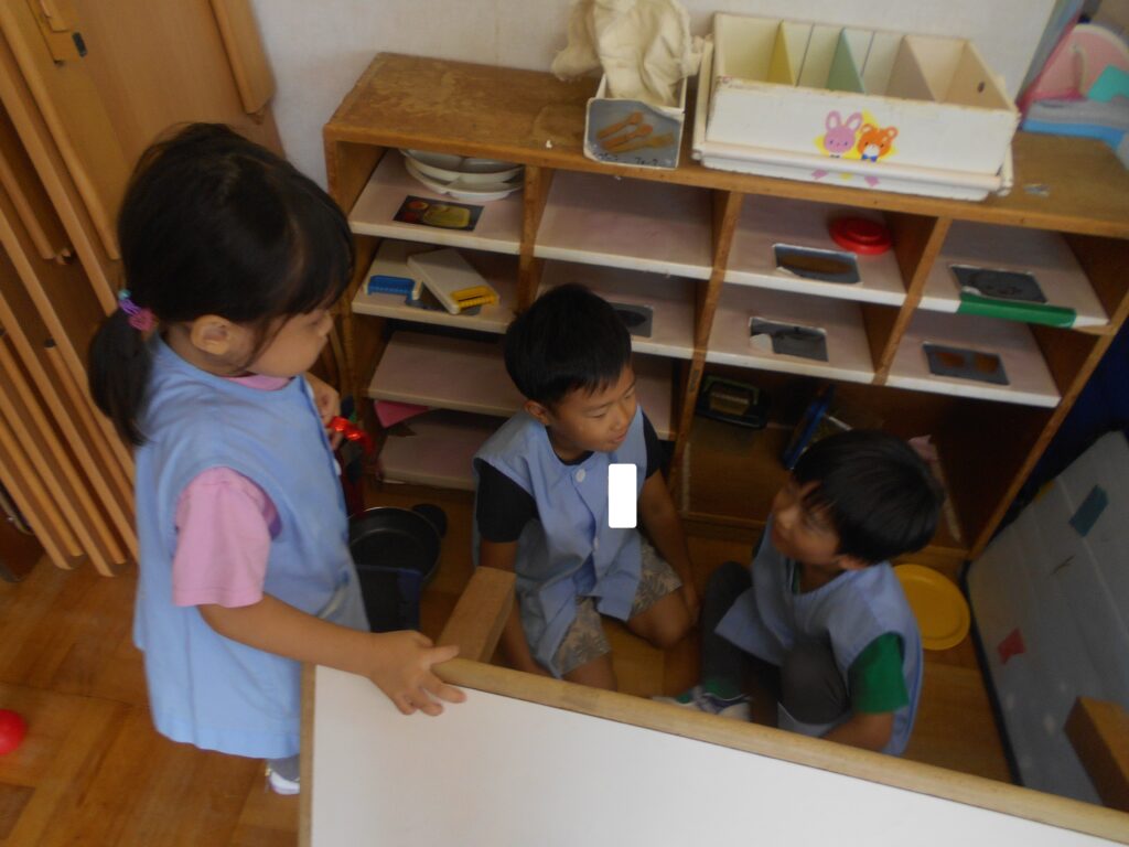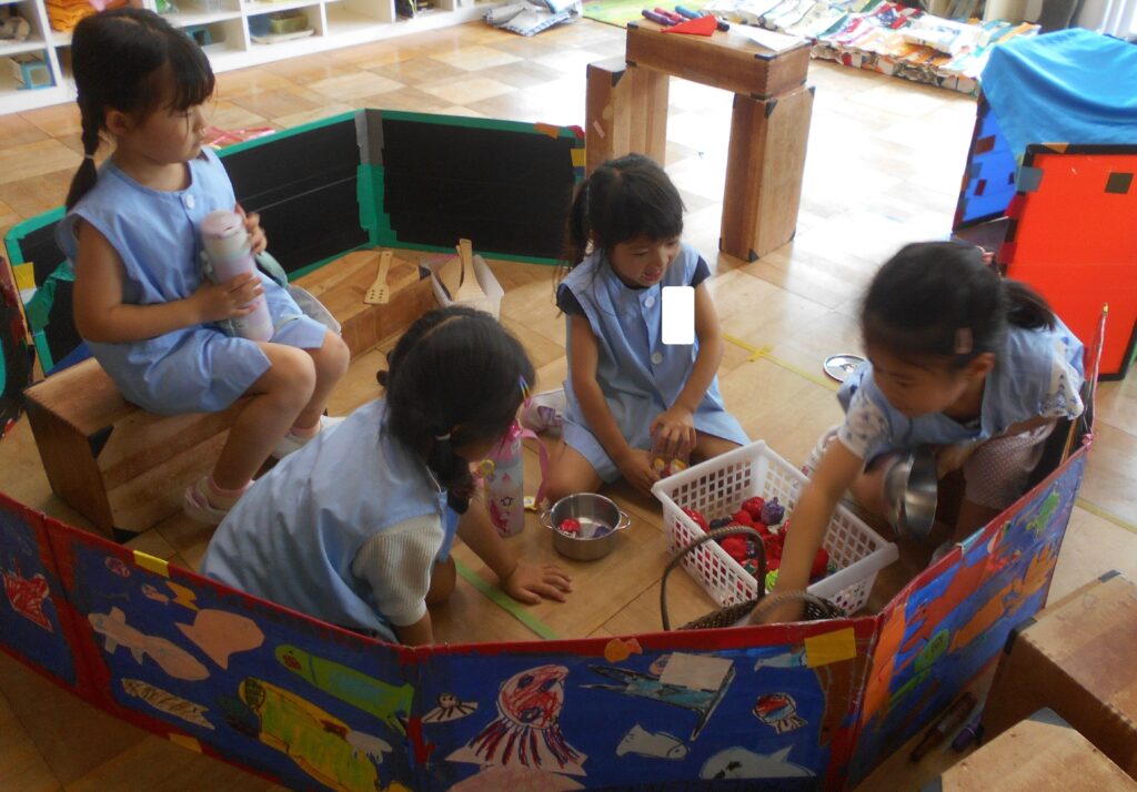 ばら組のお友達は,お友達とイメージを共有しながら,衝立など使って部屋の隅に秘密基地を作りました。