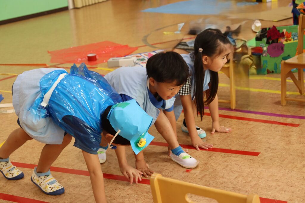 もり組のお友達は,オリンピックの陸上競技の選手になって,遊戯室を走ります。牛乳パックで作ったスターティングブロックを蹴ってスタートします。