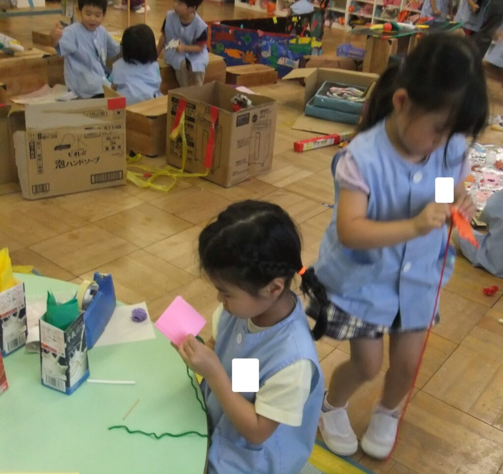 ばら組のお友達は,折り紙にあけた穴に毛糸を通しています。毛糸の先にセロテープをつけて通しやすくしたり,つまようじで穴を大きくしたりして工夫しています。